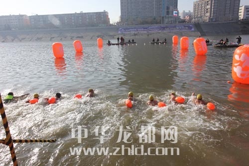 ????昨天上午,來自周口各縣市區及漯河、鄭州的300余名冬泳愛好者齊聚沙潁河,在中州大道橋附近河段展開了一場邀請賽。