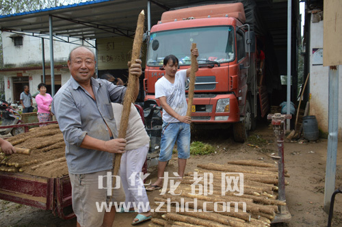 ??? 帶領家人到槐山藥行銷售自家槐山藥的老大爺,滿臉笑容地展示他收獲的長度近1米的槐山藥。