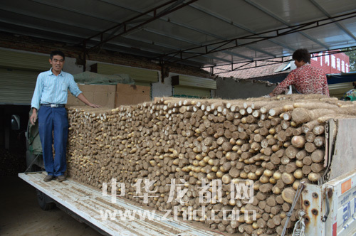 ??? 槐山藥經紀人李勝利在自己的貨車上查看槐山藥裝車情況,據他介紹,他每年要向外地銷售近5000噸槐山藥。