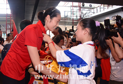 9月7日,一名學生在機場為載譽歸來的朱婷佩戴紅領巾。
