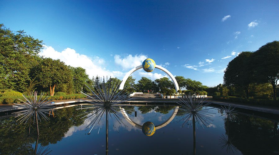 ????桂平北回歸線標(biāo)志塔坐落在桂平市石咀鎮(zhèn)小汶村附近,是我國(guó)建設(shè)的第七座北回歸線標(biāo)志塔。塔身高17.2米,跨度26米,形似一道彩虹,穿過(guò)一個(gè)直徑6米的地球,地球中間有一個(gè)直徑16厘米的小孔,名為“窺陽(yáng)孔”。每年夏至的正午時(shí)分,陽(yáng)光不偏不倚地穿過(guò)“窺陽(yáng)孔”,直射到標(biāo)志下方地面上的廣西壯族自治區(qū)地圖桂平點(diǎn)上,整個(gè)塔呈現(xiàn)神奇的“立竿無(wú)影”現(xiàn)象。這種神奇的現(xiàn)象也證實(shí)了桂平北回歸線塔建造的精準(zhǔn)性,不過(guò),錯(cuò)過(guò)這一時(shí)刻,就要再等一年才能目睹這一奇景了。