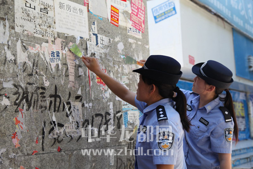 ????為深入推進創建省級文明城市工作,周口市公安局荷花分局民警走上街頭,逐一鏟除張貼在墻上、電線桿、商鋪門口等地方的小廣告。