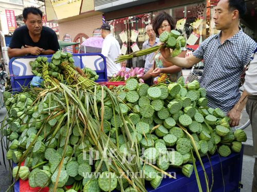 ????7月25日上午,在周口中心城區六一路上,一些流動攤販正在販賣荷花、蓮蓬,縷縷清香沁人心脾,引得不少市民爭相購買。晚報記者 朱海龍 攝
