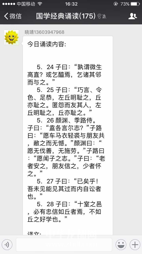 ????建立該微信群的是團市委工作人員劉曉靖。劉曉靖告訴周口晚報記者,建立該微信群的目的是想讓大家多讀讀國學經典,增加大家的文學涵養,讓大家養成讀書的習慣。“剛開始只有十幾個人,大家有些不好意思,有的人覺得自己讀得不好張不開口,我就做一些示范,引領大家誦讀。不久,加入微信群的人多了,通過幾個人帶動,大家誦讀的就多了。”劉曉靖說,讀的方式就是大家通過微信的語音功能,讀一些《論語》中的經典句子。過了一段時間,大家對這種方式越來越認可,加入該微信群的人也越來越多,人數從剛開始的十幾個人增加到近200人。現在,該微信群里不但有電臺、電視臺的專業主持人,而且有一些學者。以前拿不準的字,現在都會有人講解,大家也有了學習對象。這個微信群從成立到現在,《弟子規》、《大學》、《中庸》、《論語》已讀一遍,四書里面只剩下《孟子》還沒有讀。
