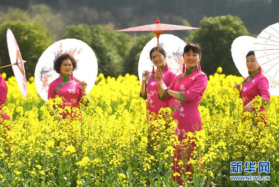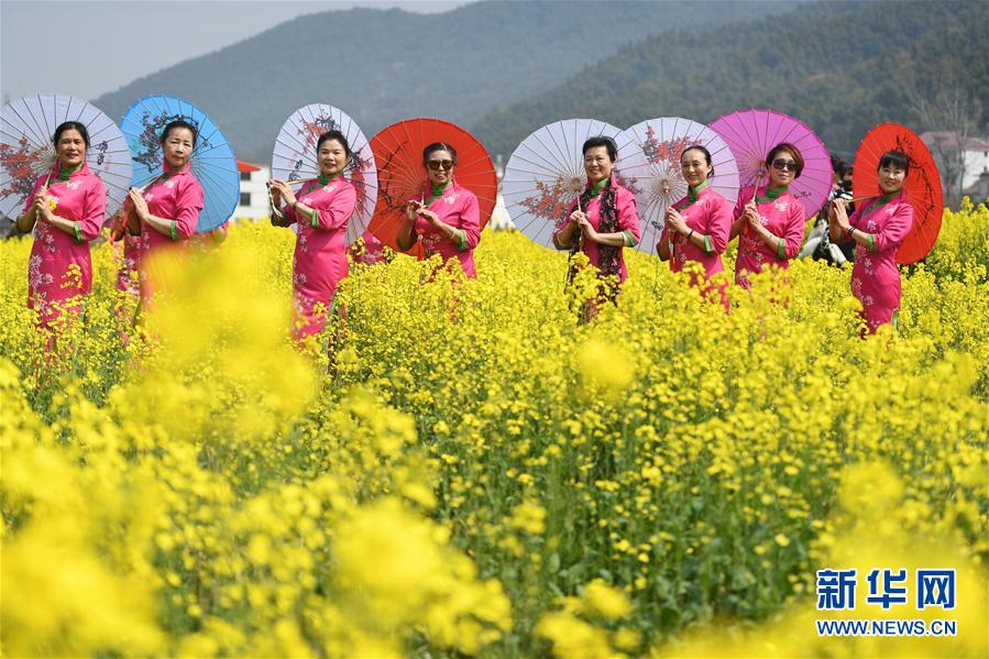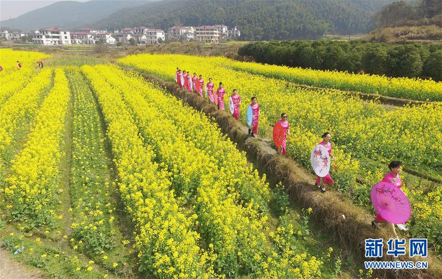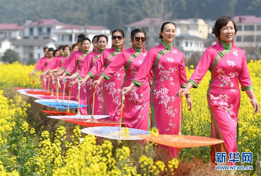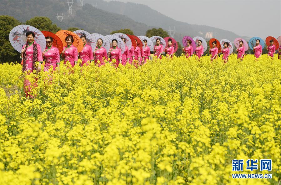 ????3月8日,旗袍隊(duì)在油菜花田中表演旗袍秀。當(dāng)日是“三八”婦女節(jié)。一支老年旗袍隊(duì)在江西省南昌市灣里區(qū)太平鎮(zhèn)獅子峰景區(qū)的油菜花田里,上演一場(chǎng)別開生面的“花田旗袍秀”,吸引眾多前來賞花的游人駐足觀看。新華社記者 萬象 攝