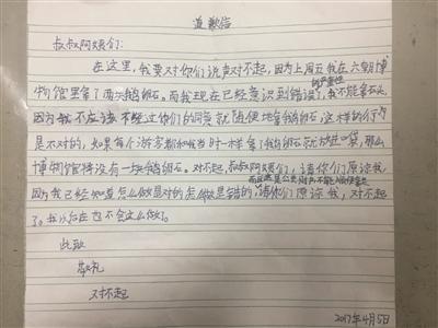 ????孩子的道歉信。 ????揚子晚報訊(記者 張可)南京六朝博物館想尋找一名小觀眾。上月底這個孩子跟著班級春游來博物館參觀時,悄悄拿走了展廳里用于布展的兩塊鵝卵石,幾天后他又帶著道歉信和鵝卵石,回來承認錯誤。六朝博物館的工作人員告訴揚子晚報記者,叔叔阿姨們不僅原諒了他,還想表揚孩子身上“知錯就改”的勇氣、精神,并授予他“名譽小館員”的稱號。 ????門口大廳害羞徘徊半天,終于道出實情 ????南京六朝博物館的安保人員小朱最先注意到這個孩子。“4月8日下午,看見他在博物館一樓入口處的大廳站了半天,猶猶豫豫的樣子,上去一問,伸出手遞給我兩塊鵝卵石和一封道歉信。”小朱告訴揚子晚報記者,孩子看上去很害羞,小臉通紅,說要把石頭還回來。 ????原來,今年3月31日,南京一所小學的幾個班級到六朝博物館參觀,當時這個孩子悄悄拿走了展廳里鋪在步道旁的鵝卵石。“其實31日當天參觀結(jié)束時,有老師帶著另一個孩子向售票處的工作人員還了一顆鵝卵石并道歉,但兩個孩子不是同一個人。”六朝博物館的工作人員介紹,后來在監(jiān)控視頻回看發(fā)現(xiàn),這名送道歉信的孩子是當天媽媽騎著電動車送來的,媽媽一個人在門口的人行道上等著,讓孩子自己進去說。 ????孩子的道歉信寫得質(zhì)樸而真切。“在這里,我要對你們說聲對不起……我不應(yīng)該不經(jīng)過你們的同意就隨便地拿走鵝卵石……如果每個游客都和我當時一樣拿了鵝卵石就放進口袋,那么博物館將沒有一塊鵝卵石……請你們原諒我,對不起了,我以后在(注:原文如此)也不會這么做了。”