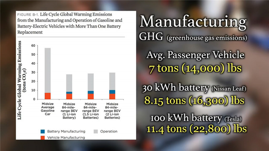 ????????無疑,電池比起傳統內燃機排放的溫室氣體要多的多。普通的內燃機乘用車在生產過程中會產生7噸的溫室氣體排放,而使用30千瓦時電池的日產聆風會排放8.15噸溫室氣體。至于100千瓦時電池的特斯拉Model S P100D更是會產生11.4噸的溫室氣體。