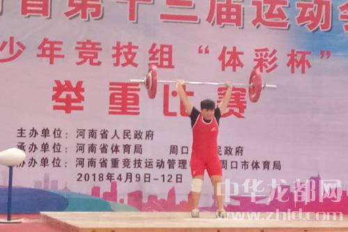 中華龍都訊(記者姬慧洋文/圖)4月9日下午,省十三運會青少年競技組舉重比賽女子乙組+69公斤級比賽在周口市體育中心開賽,來自全省的10位選手經過激烈角逐,17歲周口小將林翠愛以抓舉75公斤、挺舉95公斤,總成績170公斤的戰績,為周口代表隊再添一金。