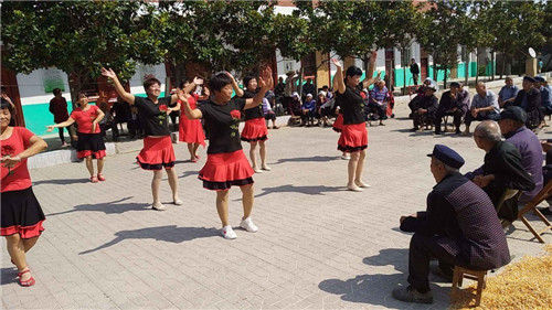 活動(dòng)現(xiàn)場(chǎng),隨著婉轉(zhuǎn)悠揚(yáng)的歌曲響起,統(tǒng)一服裝的舞蹈隊(duì)阿姨們翩翩起舞,老人們都搬著小板凳圍坐成一圈,氣氛一片祥和。
