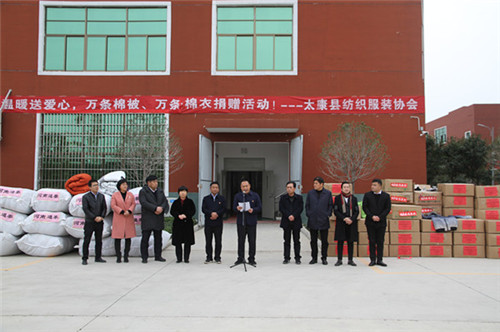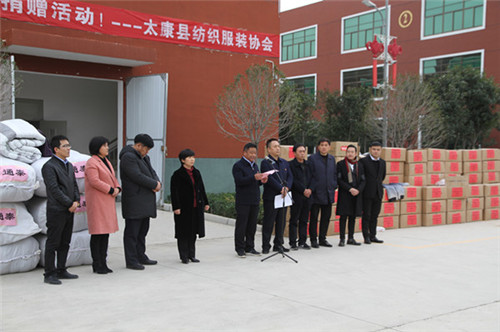 太康縣委副書記、政法委書記王程清在致辭中指出,扶貧濟困、樂善好施是中華民族的傳統美德,通泰紡織、銀鑫棉業、萬利源棉業等縣紡織協會成員單位通過捐款捐物、產業幫扶、就業幫扶、基礎設施幫扶等多種形式投入到脫貧攻堅行動中,幫助貧困群眾發展生產、改善生活條件、擺脫疾病困擾、完成學業夢想、為貧困群眾早日脫貧貢獻出自己的一份力量,并為他們捐贈棉衣棉被的善舉表示感謝。