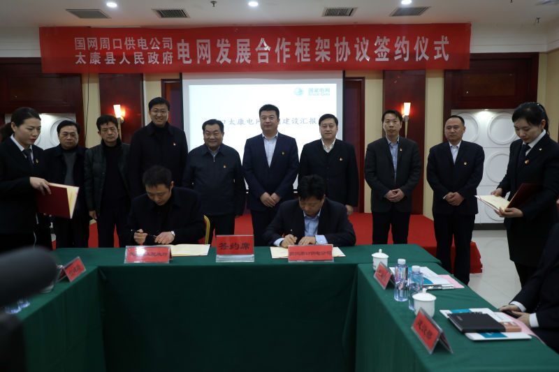 2月13日,太康縣人民政府與周口市供電公司舉行電網發展合作框架協議簽約儀式。周口市供電公司總經理郭雷、副總經理靳玉林,紀委書記、工會主席張浩,太康縣領導王國璽、董鴻、喬偉等出席簽約儀式。縣委常委、縣委辦公室主任董鴻主持簽約儀式。