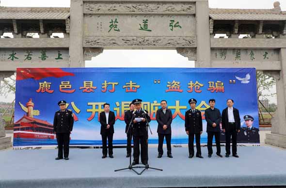 4月25日上午,鹿邑縣召開打擊“盜搶騙”專項(xiàng)行動(dòng)公開退贓大會(huì)。縣委常委、政法委書記侯自峰出席會(huì)議并講話。縣公、檢、法、司等有關(guān)部門負(fù)責(zé)人與群眾代表近300人參加退贓大會(huì)。