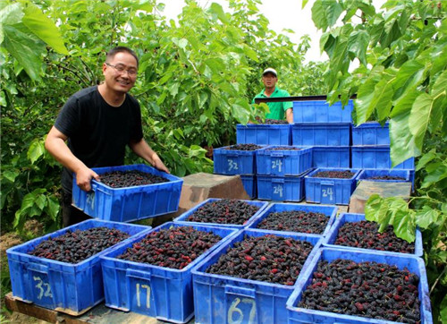 除此之外,桑果的采摘全靠人工,是勞動密集型產業,需要大量當地的勞動力,每到采摘季節,公司都會招用周邊200余名村民到種植基地務工,僅此一項,為每名務工人員人均增收3000余元。“俺在益品桑椹種植基地采摘桑椹,每天都有100多元的收入。”今年63歲的黃橋鄉孫堤村留守婦女趙美容高興的說。