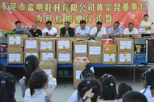 當日下午,廣東東莞富明鞋材有限公司董事長黃宗昆為母校薛廟小學師生捐贈愛心運動鞋儀式在馬頭鎮薛廟小學舉行。馬頭鎮中心校副校長李永長、中心校辦公室主任章紅勝、薛廟行政村黨支部書記黃志華等村兩委領導、校長黃景思、名譽校長孫道紅、全校260 多名師生及部分學生家長600多人參加了當天的捐贈儀式。