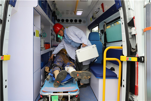 施工現場,一處樓體地基圍墻處出現塌方,警報響起,現場警戒,消防車、救護車呼嘯而至。消防人員緊急出動,攜帶工具沖到事故點,對塌方土方進行處理,一名建筑工人(模型)被從塌方土堆中救出,醫院救護人員立即施救,然后抬入救護車做進一步搶救。