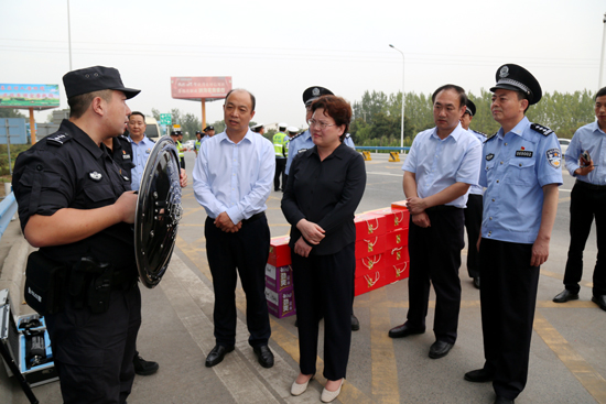 離70年大慶越來越近,喜慶的氣氛越來越濃,一線執(zhí)行安保工作的公安民警肩上的擔子也越來越重。9月24日下午,扶溝縣領(lǐng)導張穎波、詹凱、朱良杰、王霄靈及縣公安局局長田豪杰等,來到鹽洛高速扶溝站親切看望在此執(zhí)勤的公安民警。