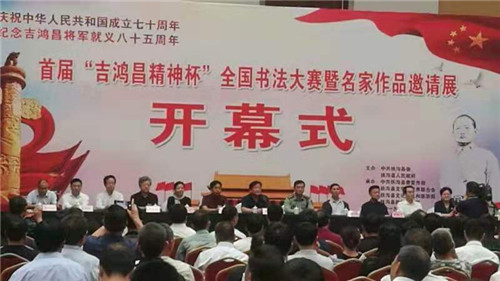 為紀念抗日民族英雄吉鴻昌將軍就義85周年,大力弘揚愛國主義精神和中華民族優秀傳統文化,9月28日上午,首屆“吉鴻昌精神杯”全國書法大賽暨名家作品邀請展在扶溝縣體育館隆重舉行。原廣州軍區政治部副主任陳大民少將、解放軍報社原副社長田仁德少將、解放軍報社原副總編孫臨平少將、解放軍裝備學院原副政委孫南京少將、解放軍總后勤部某研究所原所長楊廷欣少將、吉鴻昌將軍親屬鄭吉安大校,市委常委、周口軍分區政委孫先振,市政協副主席張文平,扶溝縣四個班子領導及副處級干部等出席開幕式。縣委副書記、政法委書記詹凱主持儀式。