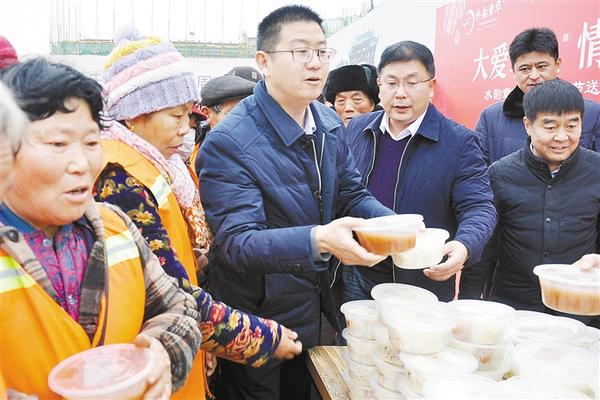 1月2日上午,商水縣在城區6處人流集中的地方設立免費送粥點,1000多碗臘八粥香飄四處,溫暖全城。圖為臘八粥發放現場。記者 付永奇 攝