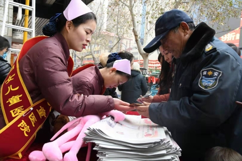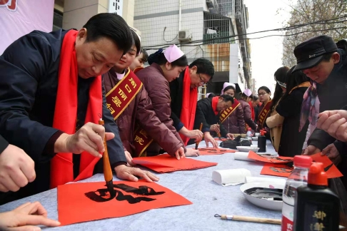 18日上午9時(shí)30分,位于新建街的周口儷嬰婦女兒童醫(yī)院門(mén)前喜氣洋洋,張燈結(jié)彩,熱鬧非凡,儷嬰婦女兒童醫(yī)院邀請(qǐng)市書(shū)協(xié)、川匯區(qū)書(shū)協(xié)的書(shū)法家們,在門(mén)前為“送福送健康暨書(shū)法家義寫(xiě)春聯(lián)”活動(dòng)舉行了簡(jiǎn)短的儀式,隨即活動(dòng)展開(kāi),一邊是儷嬰婦女兒童醫(yī)院的專(zhuān)家們將坐診臺(tái)搬到門(mén)前,細(xì)致地為來(lái)往的居民免費(fèi)量血壓、把脈等義診,一邊擺下10多張桌子和筆墨紙硯,中國(guó)書(shū)協(xié)會(huì)員游保峰,著名書(shū)法家、川匯區(qū)書(shū)協(xié)終身名譽(yù)主席李大慶,書(shū)法家馮干敏、李輝、李國(guó)斌及川匯區(qū)書(shū)協(xié)主席李尊杰,市書(shū)協(xié)副主席劉廣巖,川匯區(qū)書(shū)協(xié)副主席兼秘書(shū)長(zhǎng)杜忠義,副主席曾祥峰、何楠,著名書(shū)法家寇成義等書(shū)法家們,展開(kāi)大紅的紙張,揮毫潑墨,飄著墨香的福字和一對(duì)對(duì)大紅的春聯(lián),帶著新春的祝福,送到居民手里,一波波居民到自己喜愛(ài)的書(shū)法家面前,喜討福字和春聯(lián),開(kāi)心的喜悅洋溢著臉上……