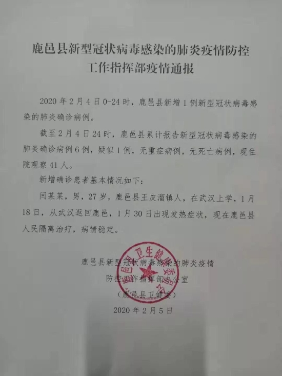 截至2月4日24時,鹿邑縣累計報告新型冠狀病毒感染的肺炎確診病例6例,疑似1例,無重癥病例,無死亡病例,現住院觀察41人。