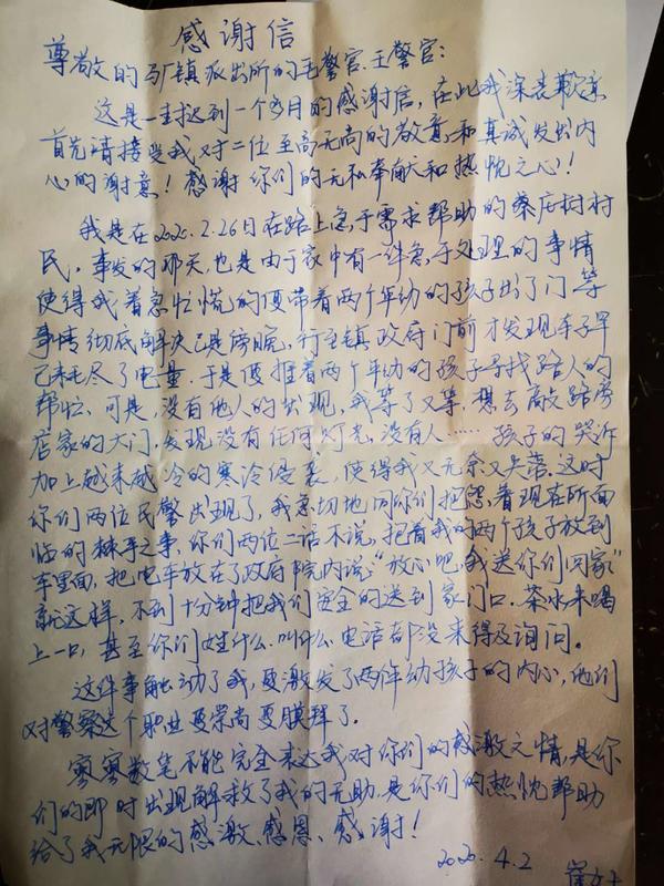 為向民警致謝,崔女士家人多次聯系馬廠派出所所長毛衛庚說要表示感謝,都被婉言謝絕了。近日,已身在鄭州打工的崔女士每次想到那晚民警們對她們的幫助都心存感激,于是她就手寫了一封感謝信,并制作了一面錦旗,從鄭州郵寄到家里,讓親戚幫忙送到馬廠派出所以示感謝。