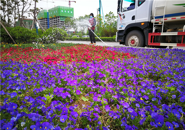 4月20日,在文昌大道道路綠化帶上,市政工人正在為栽種的花卉綠植補充水分。入春以來,我市城區一直在進行美化綠化,現在各個街道逐漸顯現出絢麗身姿。市民走在市區的每個街道都能看到各色花卉、綠植,很是養眼。