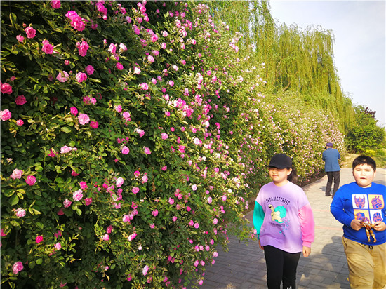 4月23日,市民從繁花滿枝狀如“瀑布”的刺玫花下走過。市體育館西南角的刺玫花正在熱烈綻放,團團簇簇綴滿枝頭,遠遠望去,宛如彩色的“瀑布”一瀉而下。不少市民在花墻前拍照、玩耍,成為市民們“打卡”地。