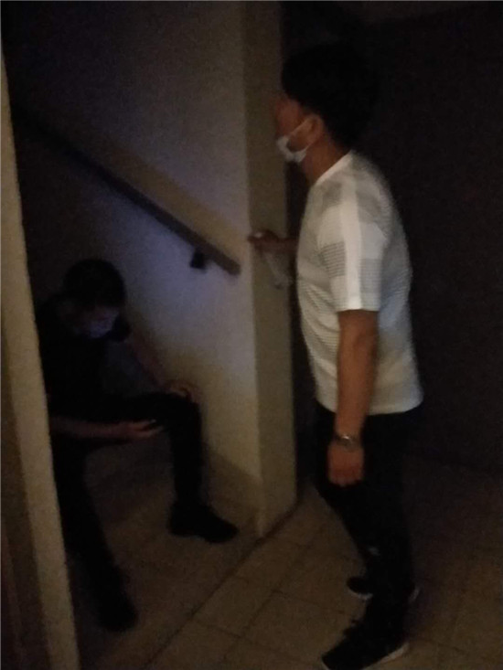 按照事先摸排到的信息,抓捕組民警終于在南京市江寧區一小區內找到了嫌疑人的居住地,而嫌疑人卻不在屋內。于是,民警們便在嫌疑人家門“守株待兔”,群里發來幾張民警坐在樓梯口蹲守照片。等待是漫長的,一直等到晚上10時許,嫌疑人始終沒有出現。民警通過嫌疑人門把手上幾天前的一張廣告單頁判斷,嫌疑人很有可能已經不在此居住,便撤離了蹲守點。