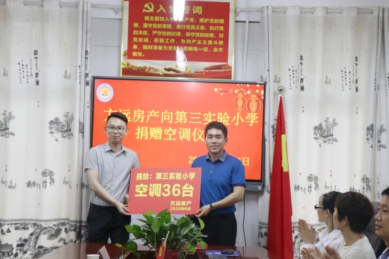“方遠房地產公司為第三實驗小學捐贈空調,大大改善學校的降溫條件,為孩子們營造更為舒適的學習環境。”第三實驗小學校長王玉剛表示,學校將以此為契機,號召廣大學生好好學習,長大后回報社會;全校教職員工以優異的教學業績回報社會,傳遞愛心,努力辦學生快樂、教師幸福、家長滿意的現代化學校。