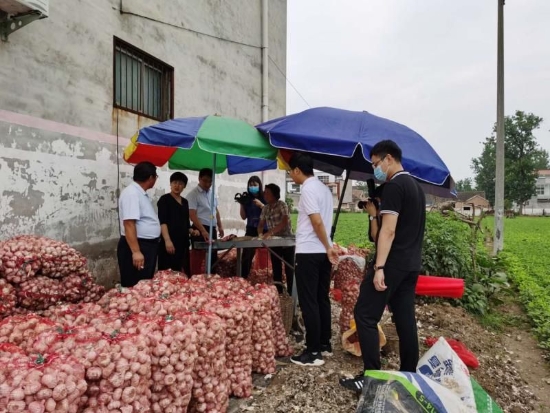今年以來,受疫情影響,王店鄉劉莊村大蒜豐收后面臨銷售難題和價格損失。為加強駐村幫扶實效,淮陽區市場監管局駐王店劉莊工作隊積極聯系愛心企業,幫助群眾解決銷售難題。賈飛邀請周口建業地產團隊到劉莊走訪農戶,向他們詳細介紹了劉莊村大蒜收成、品質及銷售情況。