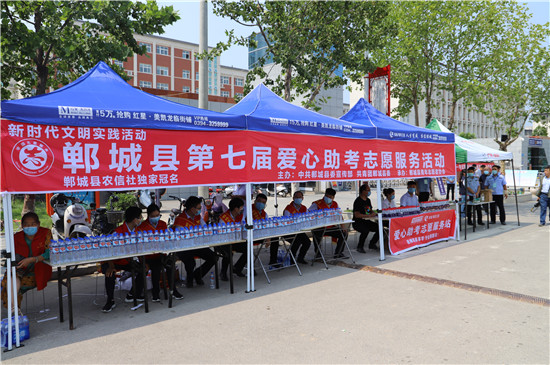 7月7日清晨,鄲城縣的志愿者們在考點外搭建“愛心助考志愿服務”站點。為考生免費提供瓶裝水、防暑應急藥品等用品,為等在考場外的家長們提供臨時休息場所、飲用水等服務,在炎熱的夏日里為他們送上一份清涼和安心,為高考學子助考加油。同時,志愿者維持考點周邊市容環境的整潔有序,對于大聲喧嘩等不文明行為及時勸阻;協助交警疏導交通,減少道路噪音對考試的影響,確保道路交通安全有序。