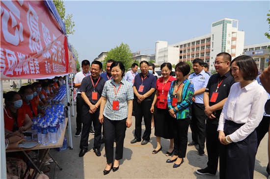 7月7日,全國高考進行時。鄲城縣為大力弘揚“奉獻、友愛、互助、進步”的志愿服務精神,由中共鄲城縣委宣傳部、共青團鄲城縣委聯合主辦,鄲城縣青年志愿者協會承辦,鄲城縣農信社獨家贊助的愛心助考志愿服務活動在全縣6個考點順利開展,身著紅馬甲的志愿者們成為服務高考的亮麗風景線。