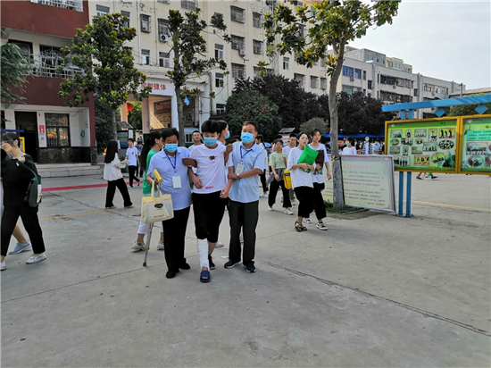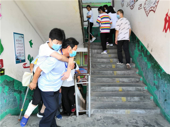 “終于到了,要不是身體好,還真不能一口氣把這孩子背上三樓。”鄲城縣第三實驗中學考務老師張子江邊擦汗邊笑著說。
