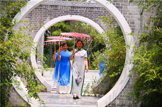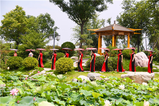 周口森林公園經過近年的建設已經成為市區休閑的一處好去處,風景優美,園林幽深,目前,盡管森林公園附近道路施工,進出還不方便,但是仍吸引著很多居民前去休閑游玩,愛美的大媽們更是在這里秀一把,7月16日上午,來自市區模特隊的大媽們,穿著靚麗的旗袍,在荷葉飄香、假山園林秀林深處,開心地進行一場模特秀。