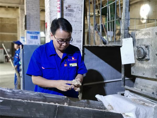 9月17日上午,大河網(wǎng)記者在河南仰韶酒業(yè)有限公司的制曲車間看到,曲磚生產(chǎn)線正在緊張生產(chǎn),張振科抓起傳送帶上的原料進(jìn)行擠壓,查看原料的水分度和粉碎度。和生產(chǎn)線的工人交流后,張振科又和徒弟來到曲庫,分別拿起半塊曲磚,放到鼻子下,深深吸氣,嗅聞曲磚的曲香。