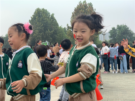 9月30日上午,在周口公園里,一群幼兒園的小朋友通過做游戲,涂畫卷等活動歡度國慶節。②9