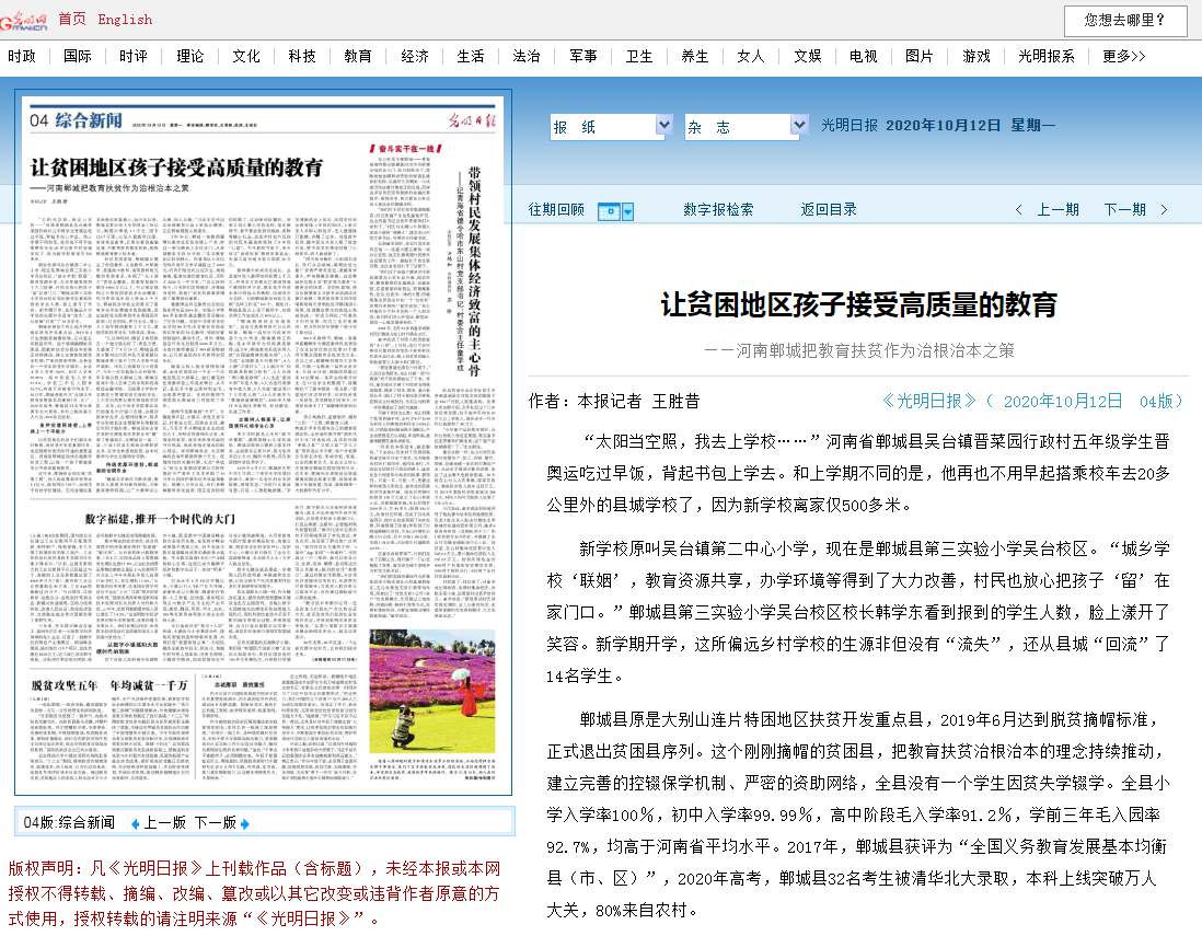 今天(2020年10月12日)出版的《光明日報》綜合新聞版,以頭條顯著位置刊登《讓貧困地區孩子接受高質量的教育——河南鄲城把教育扶貧作為治根治本之策》,對鄲城教育成果進行了詳細而深入的報道,這里全文轉載,以饗讀者——