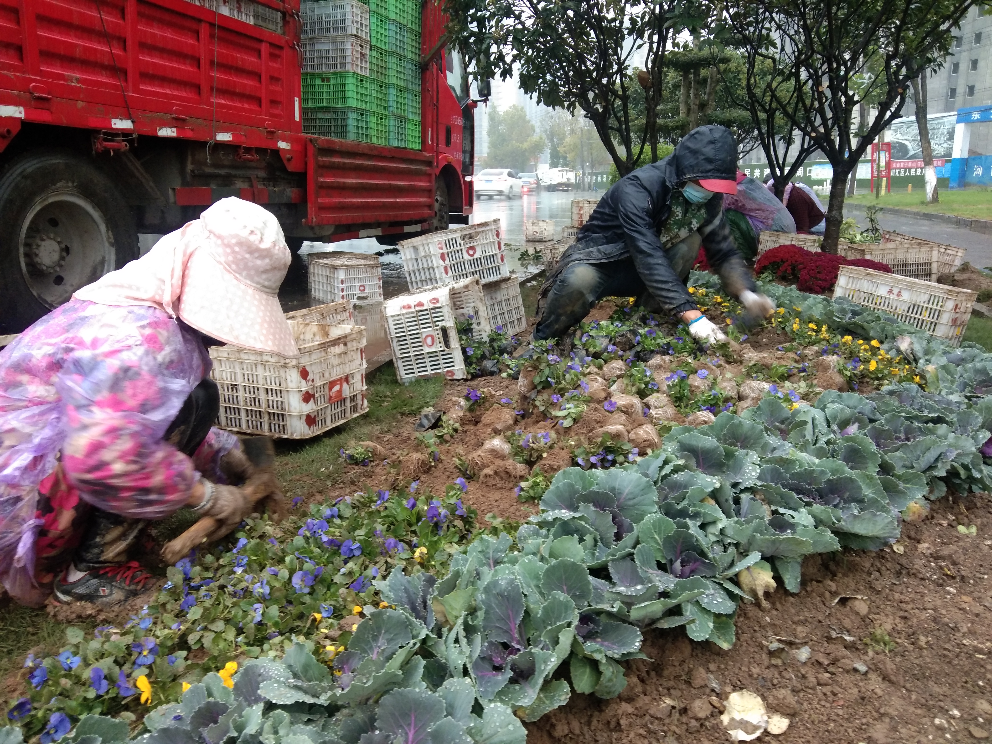 10月14日早晨,記者在周口中心城區七一路東段看到,幾名園藝工人正在道路邊的綠化帶內栽種黃色、紫色的花兒。當日,周口中心城區下起了淅淅瀝瀝的小雨,可是園藝工人卻全然不顧這些,抓住有利時機栽種花木,提高存活率,助力“創文”。記者 張洪濤 攝