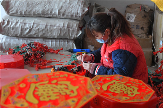 12月14日,記者在一帆工藝制作工廠內看到,二十多名村民在各自的工作崗位上有條不紊地忙碌著。簡易焊接、測試組裝、安裝炮串……一串串喜慶的電子鞭炮組成裝箱,賀潘海正在指揮工作人員裝車,現場一派繁忙的景象。