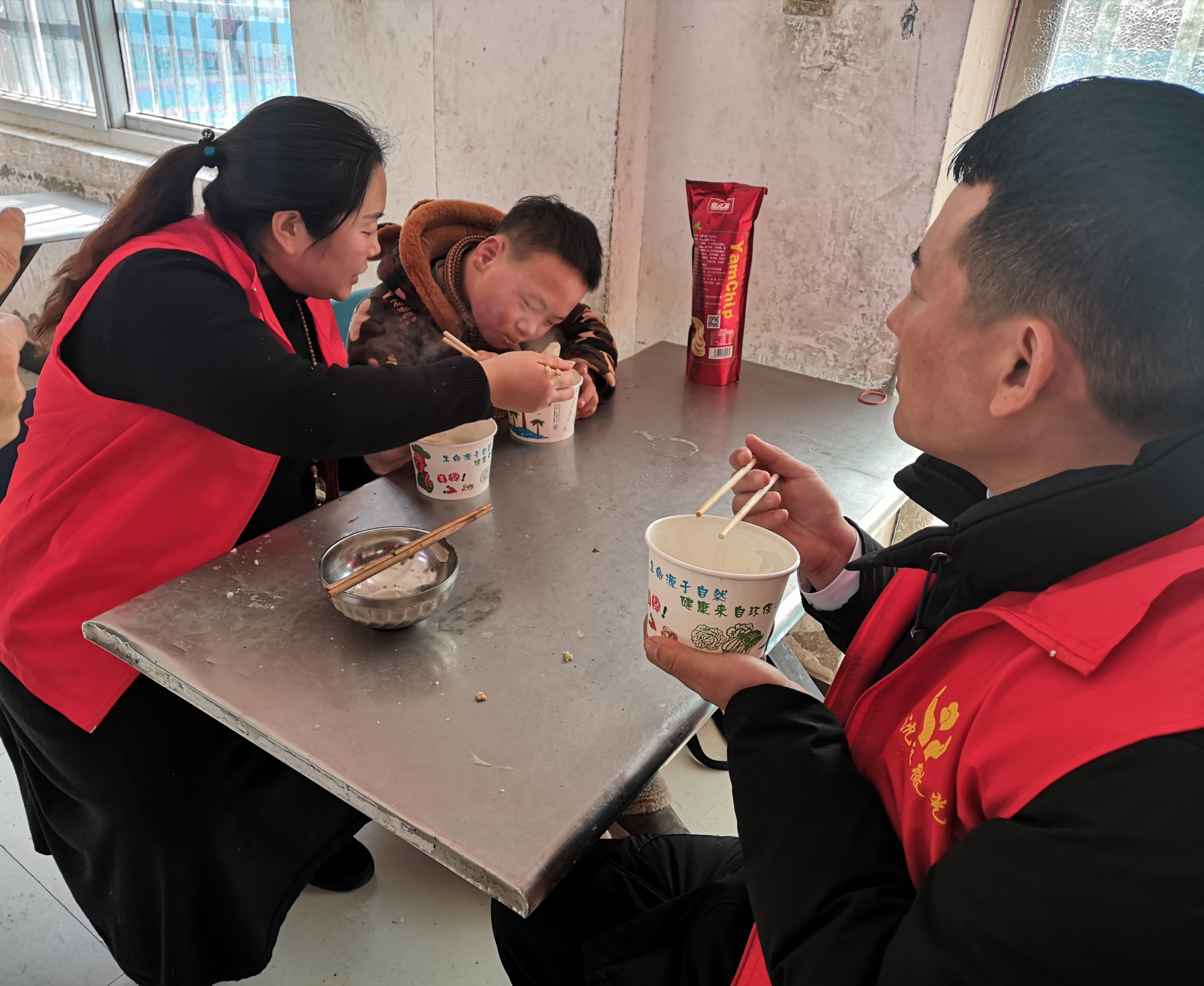 活動現場,志愿者和學生們一起揉面、搟皮、調餡,手把手地教他們包餃子。學生們興致盎然,積極參與制作餃子。大家邊聊天邊干活,餐廳內笑聲不斷。看著孩子們的笑臉,志愿者的辛苦也瞬間化為了難以言表的滿足感。餃子煮熟后,志愿者陪孩子們一起品嘗餃子,孩子們都吃得津津有味。志愿者還通過一些簡單的互動與孩子們進行交流,一起唱歌一起跳舞,手牽手完成趣味互動小游戲,其樂融融的畫面讓寒冬的校園格外溫馨。沈丘縣特殊教育學校負責人表示:“志愿者在寒冷的冬天給孩子們送來餃子和愛心食品,讓孩子們感受到社會大家庭的溫暖。我代表這些孩子感謝他們。”