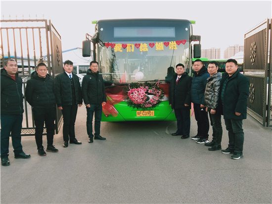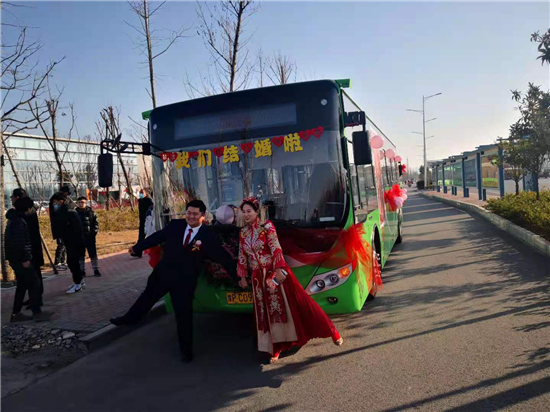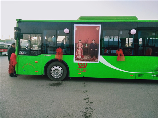 1月1日早上,裝飾一新的6輛迎親公交車吸引了眾人的目光。周口公交一公司19路公交車司機、新郎買亞飛用公交車,迎娶同為公交車司機的新娘裴丹陽,被當作婚車的公交車為新能源車,正是新郎和新娘平時駕駛的19路和9路公交車,以及15路公交車。整個婚禮,親朋好友都是乘坐公交車趕往婚禮現場,環保又有新意。