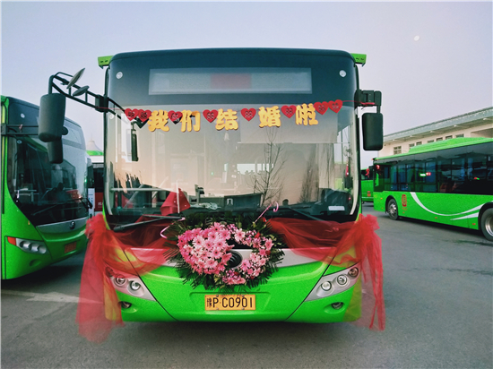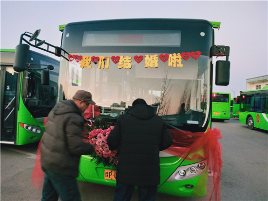 “這個想法是我和我媳婦一起商量出來的。我們覺得別人結婚都是用婚車,有點千篇一律。我們作為公交人就想另辟蹊徑,用我們公司的公交車當婚車,同時也倡導綠色出行,還很有紀念意義。” 新郎買亞飛告訴記者。