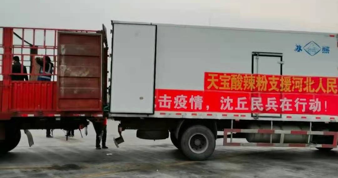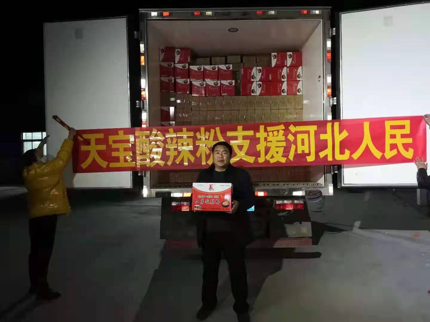 于是,他當(dāng)即與河北省南宮市相關(guān)防疫部門取得聯(lián)系,天宮那邊欣然接受,并表示感謝。1月20日當(dāng)夜,便組織召集村上的“鐵桿工人”連夜加班加點(diǎn)生產(chǎn)了價值5萬元共計(jì)1萬盒“天寶酸辣粉”,無償捐贈給河北天宮市,送去來自沈丘縣中豫天寶食品有限公司的一片愛心。