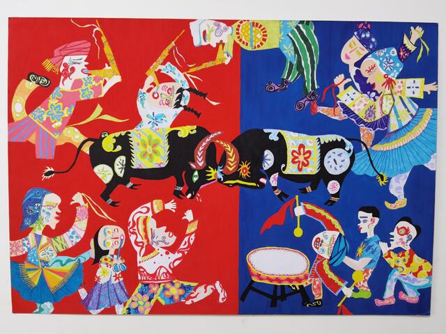 2020年4月,錢玉燕無意中看到“決勝全面小康”第二屆全國農民畫展覽征稿啟事,對農村生活非常熟悉的她決定一試。她立足于周口平原農區的特色,深深領悟周口幾千年來的農耕文化,對參賽作品進行了認真、系統地構思,最終決定以歡慶豐收的斗牛活動為題材,把農耕文化的深遠、厚重與豐富的藝術表現手法相融合。她采用普通的繪畫卡紙,運用多種繪畫顏料,充分借鑒漢畫藝術,吸收中原地區的剪紙文化、西方藝術大師畢加索立體畫派的藝術風格和古埃及畫的靈感,以艷麗的紅、藍為主背景,采取夸張的表現手法,把斗牛的場景表現得淋漓盡致。作品創作發揮了豐富的想象力,人物動物造型借鑒中國民間藝術剪紙的方式表現,以大膽、夸張、強烈的色彩搭配,把無限深廣的空間“壓扁”到一個平面上。