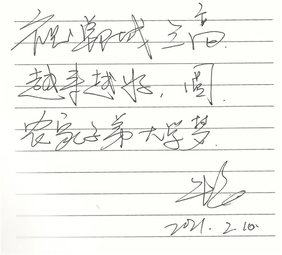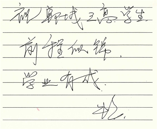 朱婷雖然很少回家,但是一直關(guān)注老家鄲城的發(fā)展變化,特別關(guān)注鄲城的教育發(fā)展,當(dāng)她得知鄲城三高率先提煉出“孝、勤、韌、忠、濟(jì)”為核心的朱婷精神,并把這種精神作為鄲城三高學(xué)子的精神引領(lǐng)時非常感動,為鄲城三高始終堅持立德樹人的教育理念而高興,為鄲城三高學(xué)子的拼搏進(jìn)取精神而欣慰,為鄲城三高辦學(xué)成果而點贊,并欣然寫下:“ 祝鄲城三高越來越好,圓農(nóng)家子弟大學(xué)夢;祝鄲城三高學(xué)生前程似錦,學(xué)業(yè)有成。”
