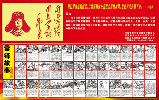 “宣傳展頁包含了一幅幅生動的雷鋒故事宣傳畫,講述了雷鋒從出生到殉職22年的事跡,真實、樸素、感人。我是唱著學雷鋒的歌曲長大的,向下一代人講述雷鋒故事、宣傳雷鋒精神,是我一生的快樂和追求。”孫永清老師說,隨著年齡的增長,身體方面的原因使他在義務宣講雷鋒精神方面有些力不從心,所以他希望把雷鋒故事畫成漫畫,制作成宣傳展頁,奉獻給全省中小學校,讓雷鋒精神永駐校園,“退休前,宣傳雷鋒精神是我的業余愛好,現在退休了,傳承雷鋒精神就是我的主業,我愿做一顆種子,把雷鋒精神廣播在下一代的心中。”①9