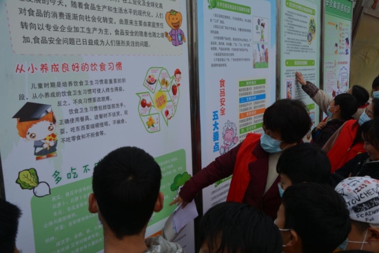 活動現場布置了食品安全知識展板,懸掛宣傳條幅,發放了宣傳冊和彩頁,600余師生參加活動。港區分局工作人員向師生現場講解如何識假辨假、什么是三無產品、進店要進證照齊全店、營業執照及食品經營許可證的樣式、如何辨認保質期、杜絕“垃圾”食品等食品安全基本知識。學生們聽得津津樂道。通過聆聽講解,進一步增強了廣大師生的食品安全意識和識別常識,為營造安全放心校園環境奠定基礎。在食品安全展板前廣大師生看的認真、聽得仔細,市場監管人員講得生動實用。學生一致認為,通過聆聽講解看展板,使我們加深了食品安全知識的掌握、開拓了視野,一定發揮“小手拉大手”作用,向父母、家人宣傳食品安全知識,爭當食品安全知識的“小喇叭”。