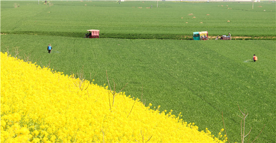 3月24日,河南省商水縣郝崗鎮北社村村民在管理麥田。春分到來,天氣變暖,鮮花盛開,素有“豫東糧倉”之稱的商水縣進入春耕備耕忙碌時節,村民紛紛走向田野,伴著花香開展春季農業生產,田間地頭一片熱火朝天的繁忙景象。②7