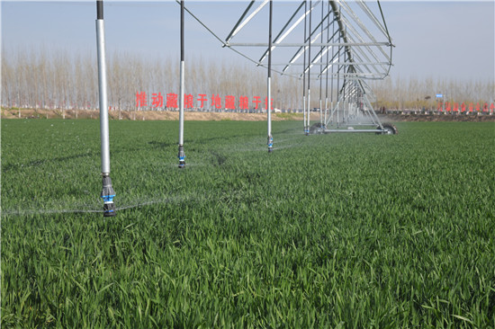 3月28日,商水縣天華合作社調試中的自走式節水灌溉設備正在噴水。