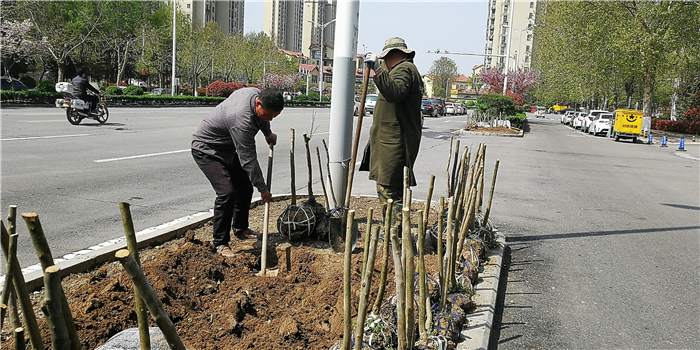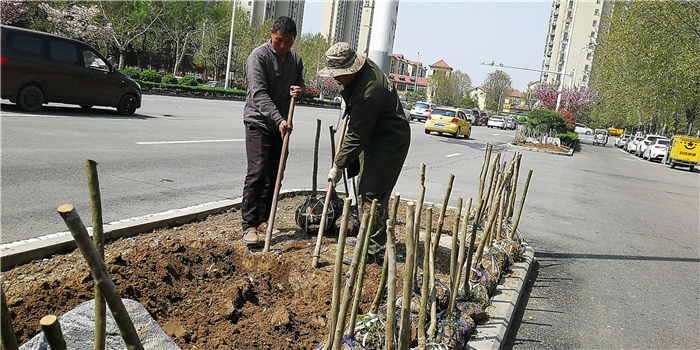 仲春時節,我市積極打造街頭游園、口袋公園,增加市民休閑游樂場所。圖為園林工人正在施工。②7